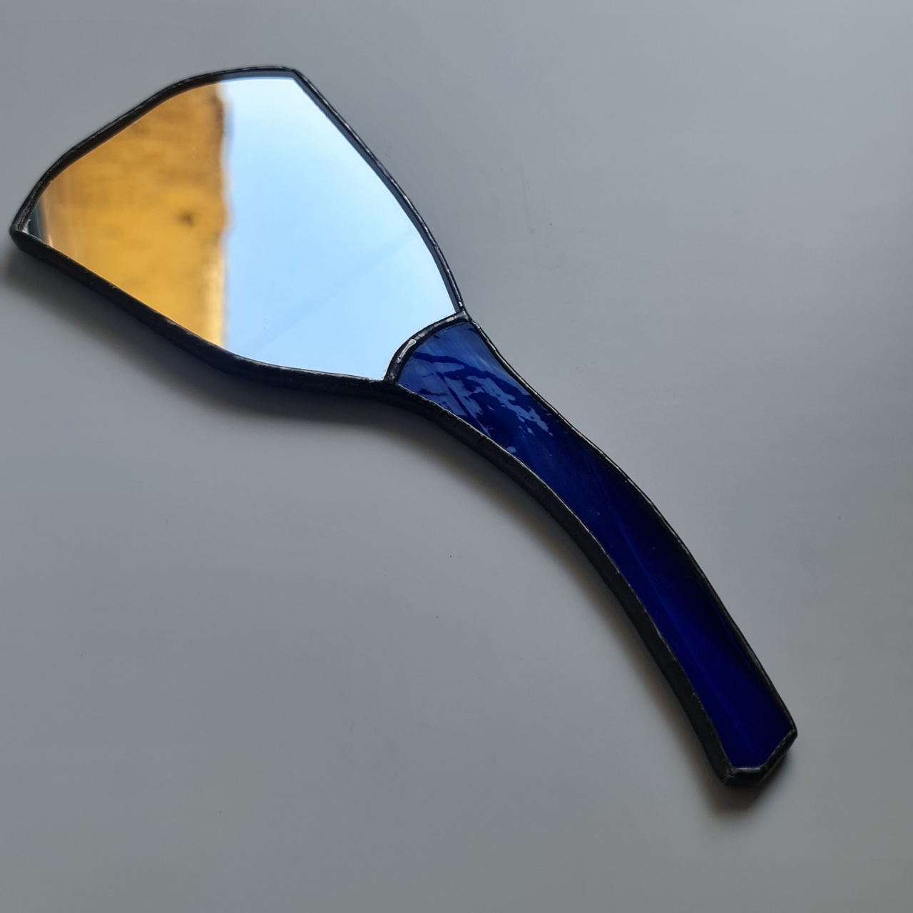 Дзеркало виконане у формі синьої квітки, обладнане шикарною ручкою.